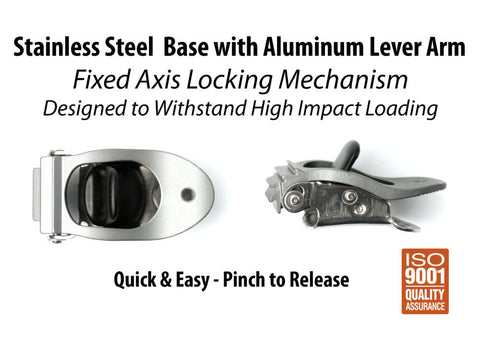 Stainless Steel Option: 1″ Stainless Steel Ratcheting Buckle is designed for outdoor and industrial applications in harsh environmental conditions. Base, springs and rivets are stainless steel AISI 304, lever arm is anodized aluminum.